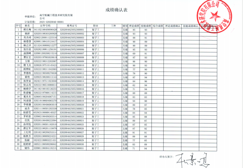 关于2025年5月23日架子工五级工职业技能等级认定考核成绩公示