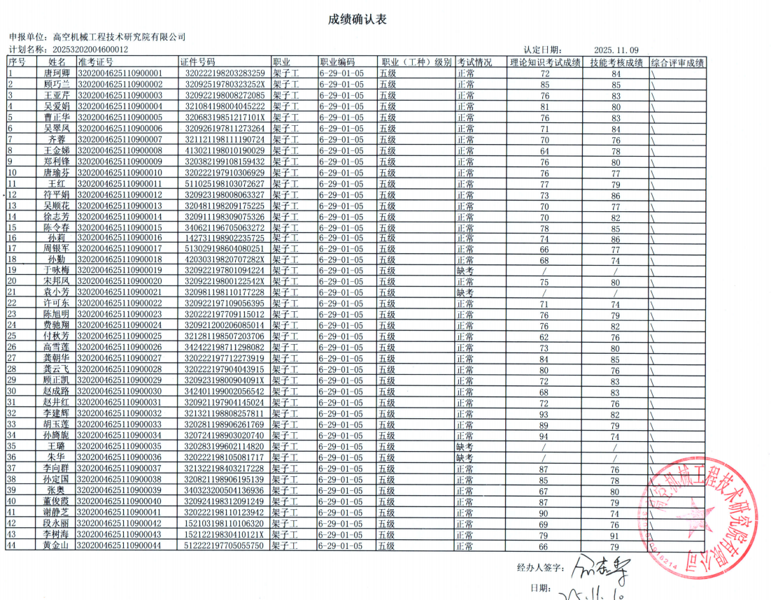 根据«江苏省职业技能等级认定实施细则»(苏人社发【2019】178号)相关规定,现将2025年11月9日架子工五级职业技能等级认定成绩予以公示。公示期为2025年11月10日至11月15日。如有异议,请与高空机械工程技术研究院有限公司认定办公室联系,联系电话:0510-85102222。