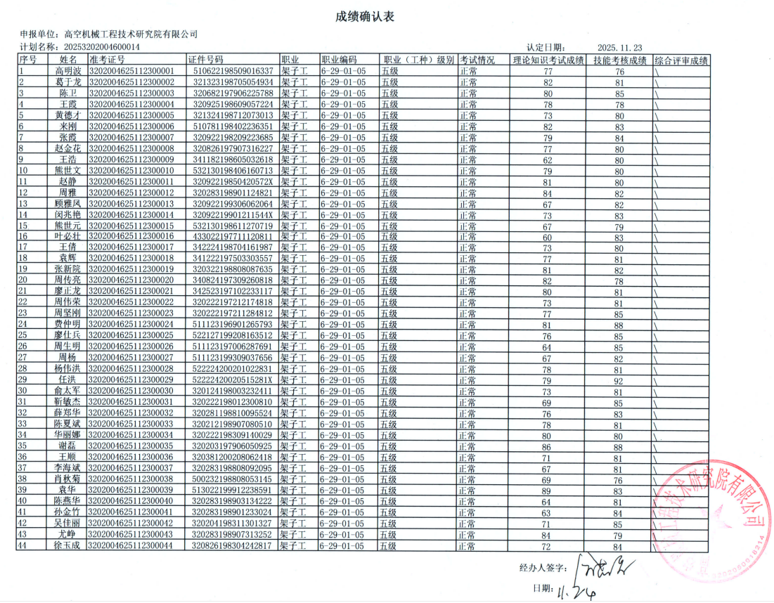 根据«江苏省职业技能等级认定实施细则»(苏人社发【2019】178号)相关规定,现将2025年11月23日架子工五级职业技能等级认定成绩予以公示。公示期为2025年11月24日至11月29日。如有异议,请与高空机械工程技术研究院有限公司认定办公室联系,联系电话:0510-85102222。