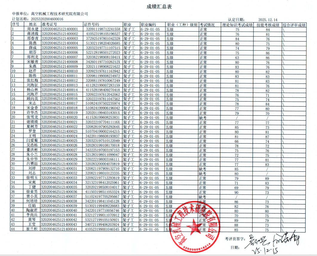 根据«江苏省职业技能等级认定实施细则»(苏人社发【2019】178号)相关规定,现将2025年12月14日架子工五级职业技能等级认定成绩予以公示。公示期为2025年12月15日至12月20日。如有异议,请与高空机械工程技术研究院有限公司认定办公室联系,联系电话:0510-85102222。